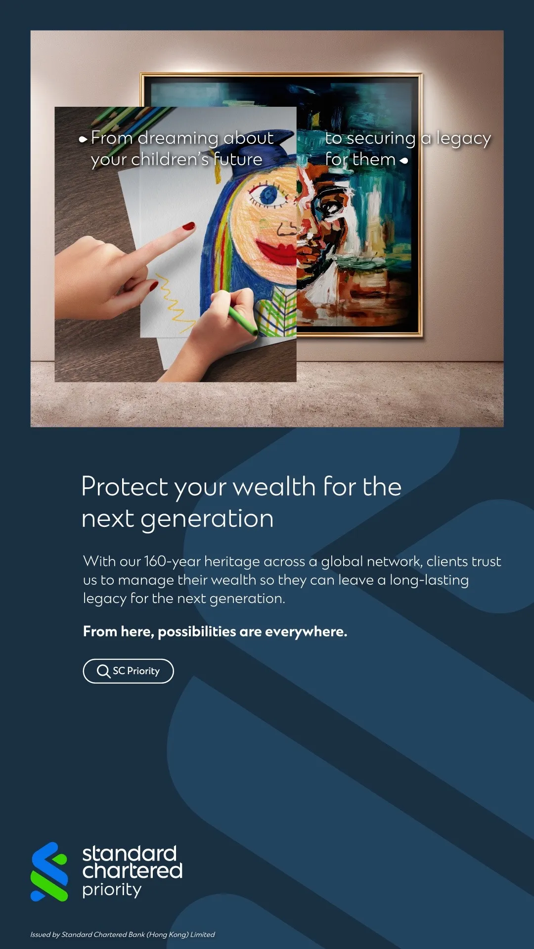 The history of Standard Chartered in Hong Kong dates back to 1859. It is currently one of the Hong Kong SAR’s three note-issuing banks. Standard Chartered incorporated its Hong Kong business on 1 July 2004, and now operates as a licensed bank in Hong Kong under the name of Standard Chartered Bank (Hong Kong) Limited, a wholly owned subsidiary of Standard Chartered PLC.