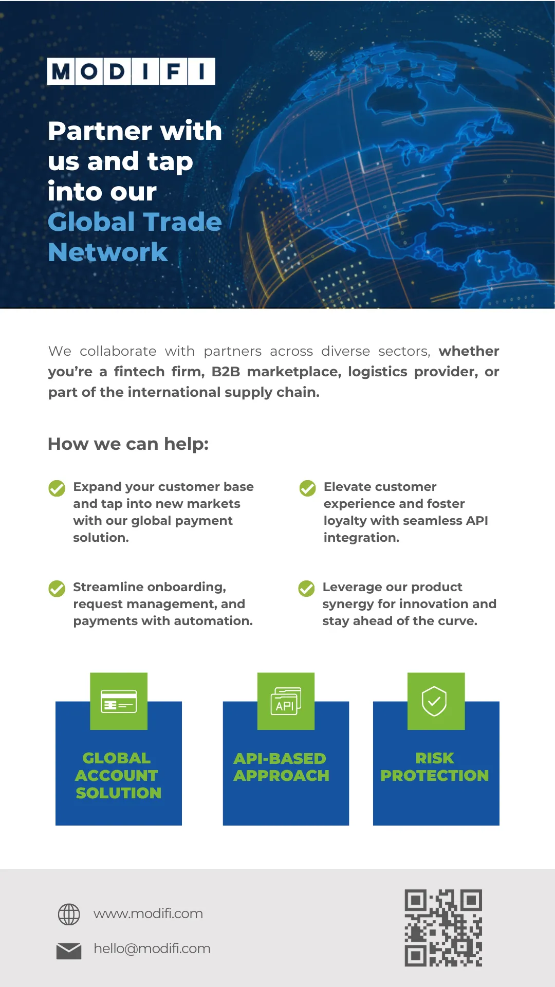 MODIFI is a leading fintech platform specializing in B2B cross-border financing and payments solutions. Through its digital platform, the company removes traditional barriers to global trade and empowers midsize businesses with the modern tools and financial liquidity needed to compete in the global commerce landscape.